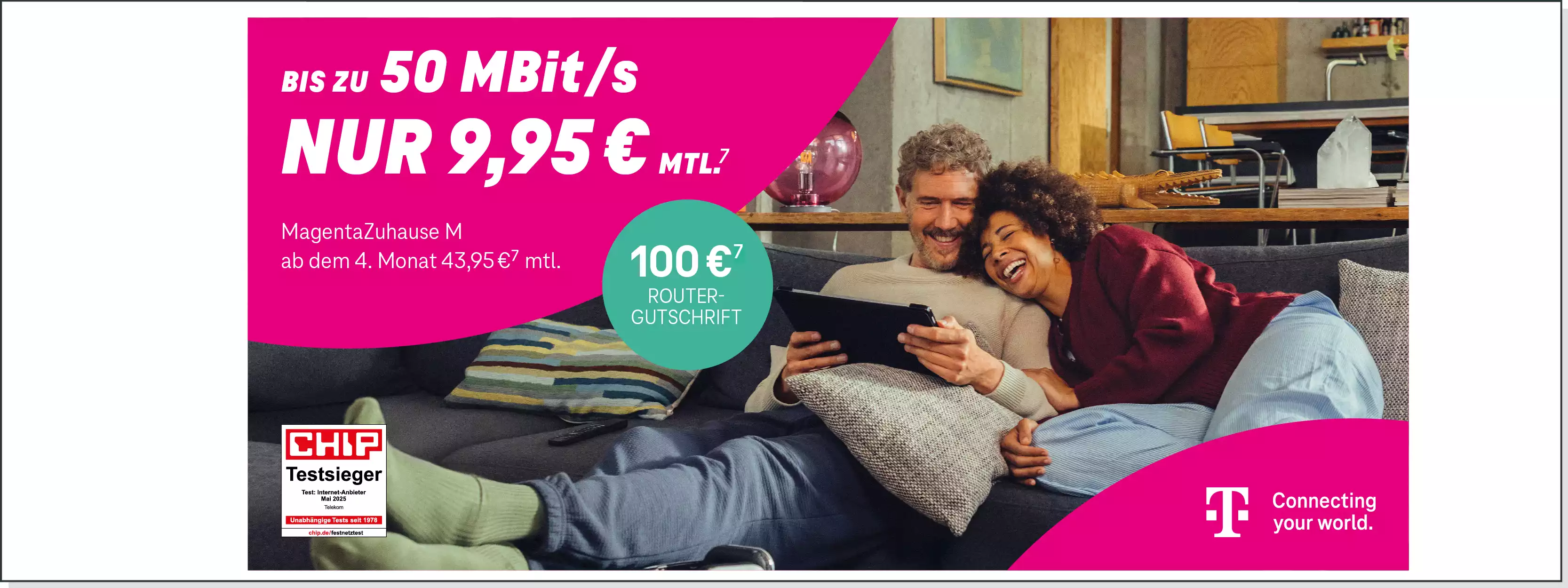 7) Aktion gilt bis 02.02.2026 für Breitband-Neukunden, die in den letzten 3 Monaten keinen Breitbandanschluss bei der Telekom hatten. MagentaZuhause M kostet in den ersten 3 Monaten 9,95 €/Monat, danach 43,95 €/Monat. Bei Miete eines Routers im Endgeräte-Service-Paket (ab 6,95 €/Monat) erfolgt eine Router-Gutschrift i. H. v. 100 €. Hardware zzgl. 6,95 € Versandkosten. Einmaliger Bereitstellungspreis für neuen Telefonanschluss 69,95 €. Mindestvertragslaufzeit für MagentaZuhause 24 Monate, für den Router 12 Monate. Alle Preise inkl. der gesetzlichen MwSt. MagentaZuhause M ist in vielen Anschlussbereichen verfügbar.