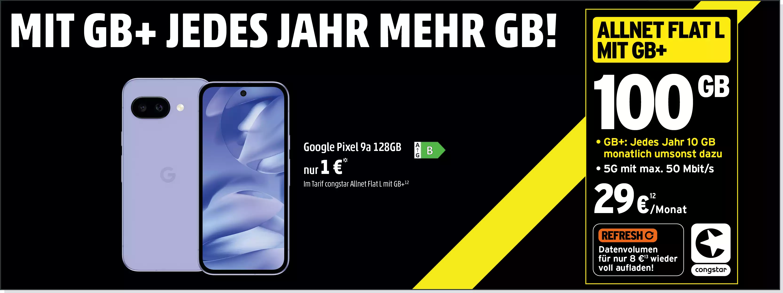 12) Aktion für Neukunden bei Buchung bis zum 04.12.2025: Die congstar Allnet Flat L mit GB+ kostet monatlich 29 €. Mindestvertragslaufzeit 24 Monate. Einmaliger Bereitstellungspreis 15 €. Die Bandbreite wird ab einem Datenvolumen von 100 GB statt 20 GB im jeweiligen Monat von max. 50 Mbit/s im Download und 25 Mbit/s im Upload auf max. 32 Kbit/s im Download und Upload beschränkt. Voraussetzung für das Surfen im 5G-Netz ist die Verfügbarkeit von 5G am Standort und ein 5G-fähiges Endgerät. Sofern 5G am jeweiligen Standort nicht verfügbar ist, surfst Du mit EDGE/LTE. GB+: Das monatliche Datenvolumen erhöht sich im Tarif Allnet Flat L alle 12 Monate um jeweils 10 GB. Bei Tarifwechsel in einen anderen Tarif gelten die Konditionen des neuen Tarifes. Für jedes Vertragsjahr im bisherigen Tarif erhält der Kunde das GB+ Volumen, welches für den neuen Tarif gilt. Das heißt: GB+ Volumen pro Vertragsjahr im bisherigen Tarif bei Wechsel in die Allnet Flat XS 1 GB, bei Wechsel in die Allnet Flat S 2 GB und bei Wechsel in die Allnet Flat M 5 GB.